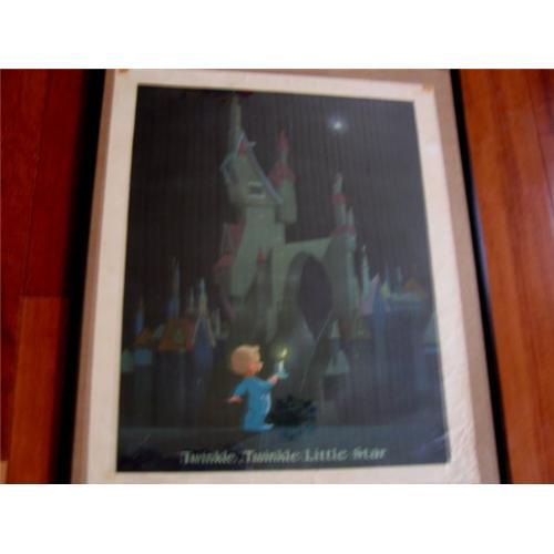 </font></strong>In 1938, the Kellogg Cereal Company of Battle Creek, Michigan, offered 6 different color lithographs featuring Snap, Crackle, and Pop in well-known nursery rhyme scenes. These could be purchased for 49 cents by sending in the offer from the cereal box. I have 3 of these original posters for sale (please see my site for the other 2). This one is Twinkle Twinkle Little Star (my own favarite of the 3), a darling image of one of the guys (I don't know who is Snap, Crackle, or Pop) at night in his pajamas with a lit candle in his hand. He stands before a dark fairy tale castle, gazing up at the bright star above it. The colors are brilliant and gorgeous. The name of the nursery rhyme is in block letters on the bottom of the picture, and at the bottom left corner of the picture is the artist's name, "Vernon Grant" in very faint lettering. On the bottom white border is written: "Picture set no. 1 consists of the following titles:--Little Jack Horner, Peter Peter Pumkin Eater, Jack and Jill, Humpty Dumpty, Twinkle Twinkle Little Star, Jack Be Nimble." The lower right corner is marked: "Copyright 1938, Kellogg Company, Battle Creek, Michigan. Printed in U.S.A." It appears to be printed on linen/heavy paper. As to condition: I purchased these encased under plexiglass in cheap black frames, in which the posters were placed for protection; I am not going to remove them from these frames (to prevent any damage), though I note from removing the top section of the frame that the poster is not ...