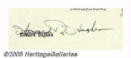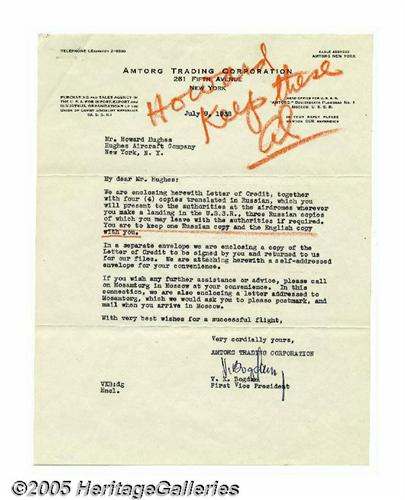 <B>1938 Letter of Credit Document Signed by Howard Hughes</B></I> July 1938 was a landmark month for Howard Hughes and the continued advancement of the aviation industry. It was the month that Hughes and a crew of four circumnavigated the globe in a heavily-modified Lockheed L-14, taking only three days and 19 plus hours to do so. New radio equipment developed by Hughes Aircraft engineers for this flight would later serve as their entry into the electronics field. Hughes and the crew would be given a ticker-tape parade down Broadway in New York City upon their return. For the aviation historian, here is an incredible lot of items related to, and carried on, that world-famous flight. First is a one-page typewritten letter from the Amtorg Trading Corporation, stating in part: <I>"My dear Mr. Hughes: We are enclosing herewith Letter of Credit, together with four (4) copies translated in Russian, which you will present to the authorities at the airdromes whenever you make a landing in the U.S.S.R.... You are to keep one Russian copy and the English copy with you..."</B></I> The next item is a one-page document in Russian, being one of these Letters of Credit, with a large and bold Howard R. Hughes signature and the embossed seal of the trading company. Also included is a small American flag purported to have been carried on this flight and a legal-size envelope addressed "TO WHOM IT MAY CONCERN, AIRDROME, MOSCOW, U.S.S.R." and postmarked July 10, 1938 at New York City. "HOWARD HUGHES GOODWILL FLIGHT" is typed on this envelope and a Russian airmail stamp has been placed beneath the cancelled U.S. stamps. Items actually flown on this monumental flight are very rare. A rare opportunity for the advanced collector. <I>Accompanied by COA from PSA/DNA.</B></I> Lot:254