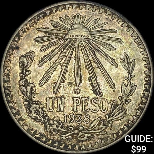 1938-M Mexico Silver Peso Cap & Ray NEARLY UNCIRCULATED