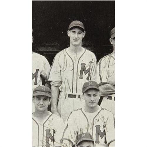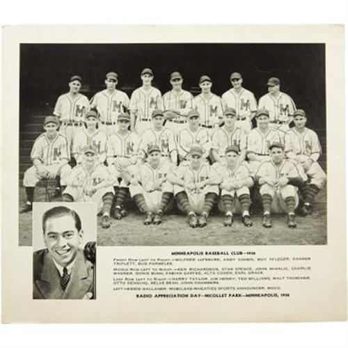 <B>1938 Minneapolis Millers Team Signed Photograph with Ted Williams.</B></I> On his final stop before the Show, a nineteen-year old Ted Williams made American Association history, becoming the first player to win the league's Triple Crown with a .366 average, forty-three homers and 142 runs batted in. Saddled with a youthful temper to match his tremendous skills, Williams became famous in Minneapolis for his outbursts, once shattering a glass water cooler with his fist after popping out, giving his teammates an early shower and almost ending his career when a shard of glass barely missed a nerve in his hand. It's been said that manager Donie Bush became so frustrated with the brash youngster that he told the team owner Mike Kelley, "Either that kid goes or I go." The reply: "We're going to miss you, Donie." Both the future legend and his manager are among the twenty Millers to sign this 8x10" photo issued for "Radio Appreciation Day" at Minneapolis' Nicollet Park, establishing this as among the earliest Williams signed baseball images in the hobby. While it must be noted that The Kid's autograph matches the others in its 2/10 to 3/10 boldness, it does remain fully legible and unmistakable. A few scattered creases are likewise noted, but, as with the light signatures, one must forgive imperfections in light of the great rarity and desirability of the piece. <I>LOA from PSA/DNA. LOA from James Spence Authentication.</B></I><BR><BR><b>Shipping:</b> Flat Material, Small (<a target="_blank" href="http://www.heritageauctions.com/common/shipping.php">view shipping information</a>)