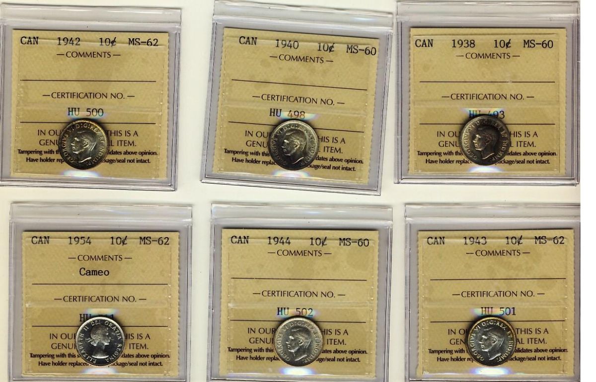 1938 MS60, 1940 MS60, 1942 MS62, 1943 MS62, 1944 MS60& 1954 MS62 Cameo 10¢, Lot of 6 ICCS graded coins.