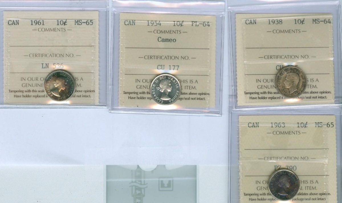 1938 MS64, 1954 PL64 Cameo, 1961 MS65 and 1963 MS65 Lot of 4 ICCS graded 10¢ coins.