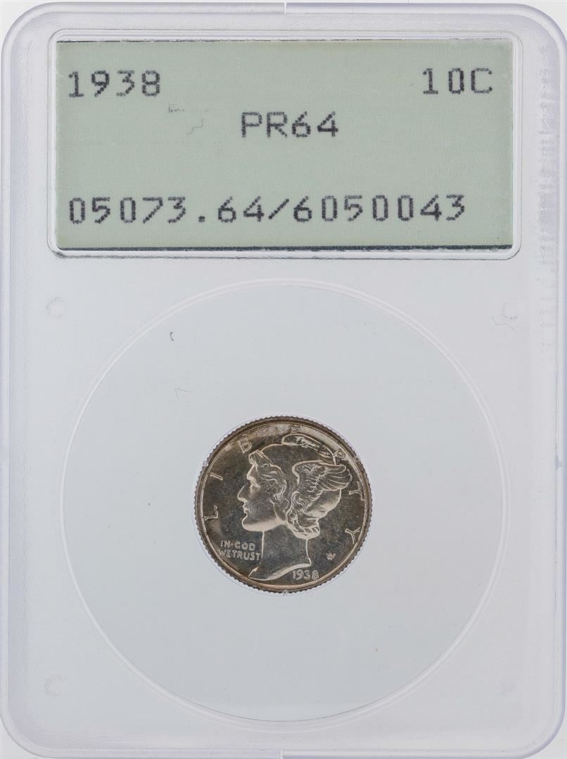 One 1938 Mercury Dime Proof Coin PCGS PR64 Old Rattler Holder. PCGS Graded.
