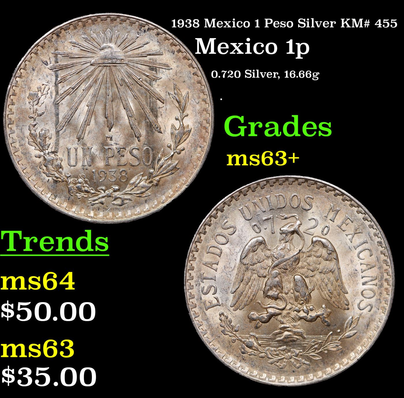 1938 Mexico 1 Peso Silver KM# 455 Grades Select+ Unc.