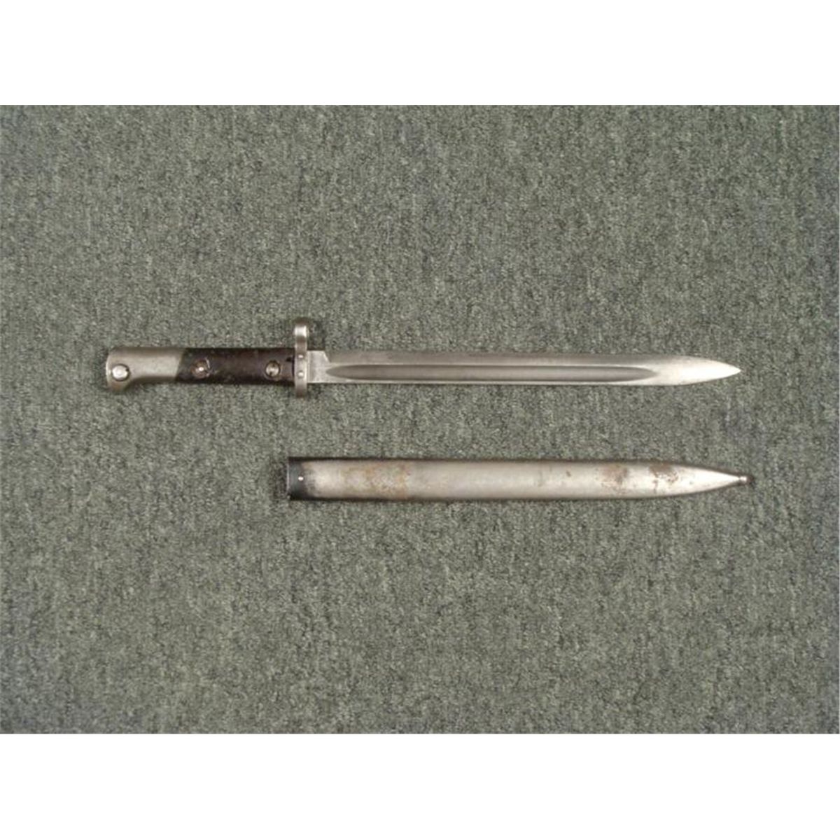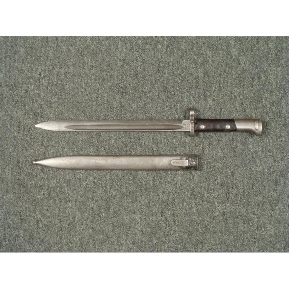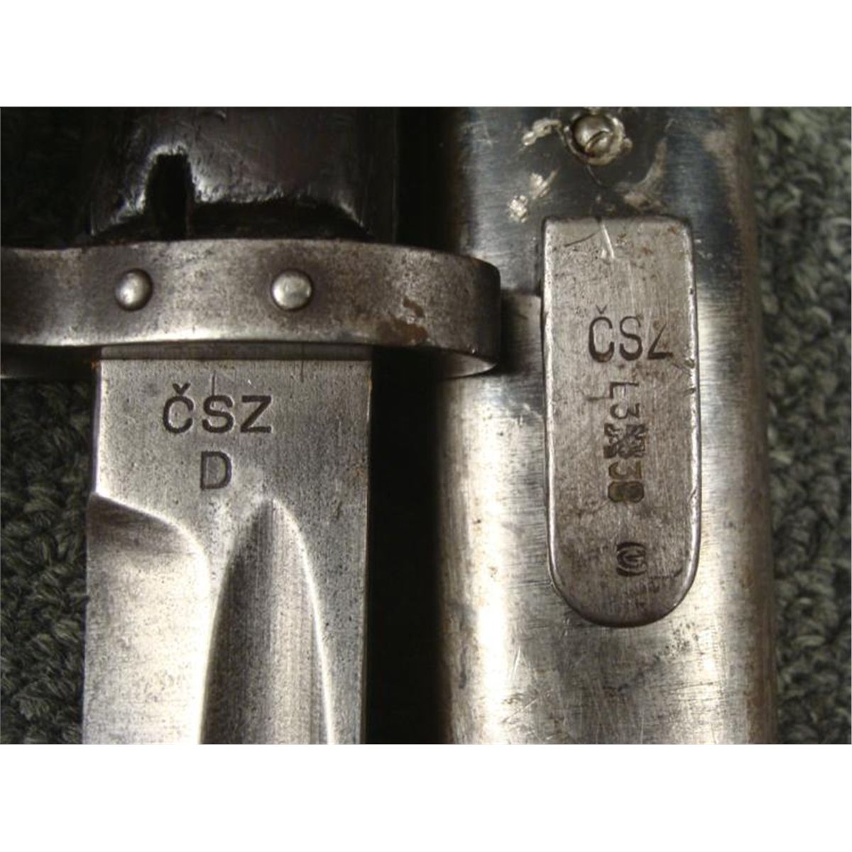 1938 NAZI/CZECH MAUSER BAYONET & SCABBARD--WELL MARKED * NAZI/CHECH MAUSER RIFLE BAYONET--WOOD GRIPS EAGLE HEAD POMMEL W/RELEASE BUTTON/WORKS FINE -GOOD BLADE-RICASSO MARKED "CSZ-D"--GOOD STEEL SCABBARD--FROG STUD MARKED "CSZ -L3 W/LION-38" SIDE OF STUD MARKED "C4 5295"--GREAT WWII COMBAT BAYONET *