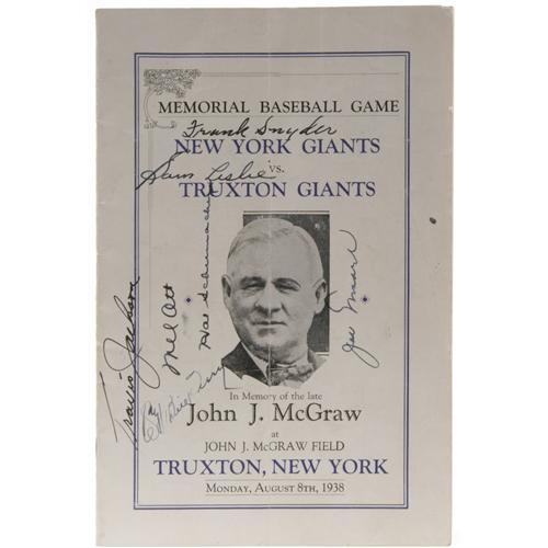 <B>1938 New York Giants Signed Program with Mel Ott.</B></I> Truxton, New York, the birthplace of the great Hall of Fame manager John McGraw, honored its departed favorite son this date with a match between McGraw's former squad and a local team bearing the same Giants nickname. Offered is a program from the August 8th event, picturing Little Napoleon on the cover, which is autographed by seven of the game's participants and attendees. Most notable are Hall of Famers Mel Ott, Travis Jackson and Bill Terry, each of whom called the Polo Grounds home for his entire career. Rounding out the autographs are Hal Schumacher, Frank Snyder, Sam Leslie and Joe Moore. All signatures remain in spectacular condition. The twenty-eight page program is solid and complete, with a center vertical crease from having been folded lengthwise, though this does very little to detract and the crease remains clear of all Hall of Fame signatures. <I>LOA from PSA/DNA.</B></I> <BR><BR><B>Important notice:</B> Heritage usually auctions material at the rate of 200-250 lots per hour. On some occasions eBay Live bid software or the Internet may not be able to keep up with the pace of the auction. We recommend placing a realistic absentee bid now as insurance to avoid disappointment. Occasionally the auctioneer may eliminate or reject an eBay Live bid, and the auctioneer may also reopen a lot after the close of the eBay live bidding (usually because we missed an audience bid), and may reject your bid even if it shows you as the winning bidder. By bidding via eBay Live, you agree that Heritage may award the lot to another bidder at its sole discretion under the circumstances described above or any other reasonable circumstances. Since eBay bids are not shown to us until we open the lot on the floor, we treat those bids just like floor bids. In most cases the floor responds before the eBay bid is presented to us, due to Internet lag time, so for consistency we have made it a policy that floor bids are always considered first over tie eBay live bids. Also please note that all Heritage lots purchased through eBay Live carry a 22.5% Buyer's Premium. Please make sure you read the Terms and Conditions before you bid. This lot is being auctioned in conjunction with a live floor auction by Heritage Galleries & Auctioneers. All final auction and invoice information will be supplied by Heritage Galleries & Auctioneers, and all other information should be considered preliminary. Lot:19070 <BR><BR><B>Winning Notification and Billing:</B> After the FINAL session in this auction is complete, Heritage will send e-mail and snail mail invoices. This process normally takes several days. All final auction and invoice information will be supplied by Heritage Galleries & Auctioneers, and all other information should be considered preliminary. <BR><BR>This auction will be conducted on a live auction floor and over the Internet through eBay Live. If you choose to place an absentee bid, please take a moment to <font color='#0000ff'><u><a href='http://pages.ebay.com/liveauctions/help/before/laabsentee.html'>learn how eBay Live absentee bidding works</a></u></font><font color='#000000'>