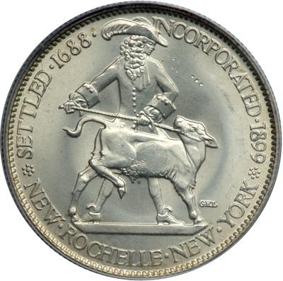 1938 New Rochelle Half Dollar. PCGS graded MS-65. Light even tone. A frosty gem with one small reed mark in the field; otherwise, pristine (PCGS # 9335) .