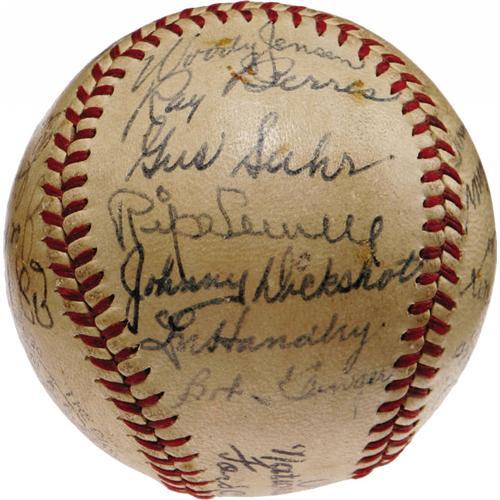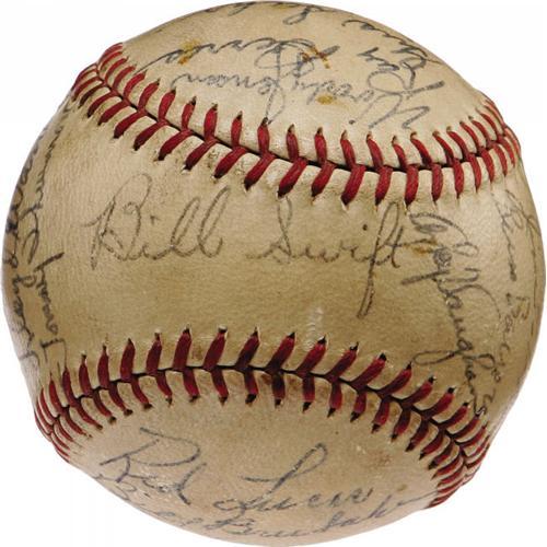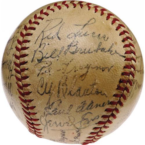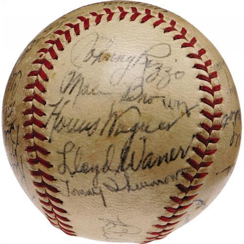 <B>1938 Pittsburgh Pirates Team Signed Baseball with Honus Wagner.</B></I> The man whose face appears on the hobby's most expensive trading card was a sixty-four year old coach for his former squad when he joined twenty-three fellow Bucs on the gently toned hide of this ONL (Frick) baseball. The Hall of Fame talent doesn't end with the Old Dutchman however, as Pie Traynor, Arky Vaughan and both Waner brothers up the ante even further. Condition is yet another feather in the black and gold cap, as the vintage blue ink averages an impressive 8/10. Mild age toning and the slightest effects of handling wear do nothing to diminish the impressive visual effect of this historic sphere. Only a single autograph, that of veteran pitcher Red Lucas, has been deemed to be secretarial. You'll be hard pressed to find a ball with more marquee names than the one you see here. <I>LOA from PSA/DNA.</B></I> <BR><BR><B>Important notice:</B> Heritage usually auctions material at the rate of 200-250 lots per hour. On some occasions eBay Live bid software or the Internet may not be able to keep up with the pace of the auction. We recommend placing a realistic absentee bid now as insurance to avoid disappointment. Occasionally the auctioneer may eliminate or reject an eBay Live bid, and the auctioneer may also reopen a lot after the close of the eBay live bidding (usually because we missed an audience bid), and may reject your bid even if it shows you as the winning bidder. By bidding via eBay Live, you agree that Heritage may award the lot to another bidder at its sole discretion under the circumstances described above or any other reasonable circumstances. Since eBay bids are not shown to us until we open the lot on the floor, we treat those bids just like floor bids. In most cases the floor responds before the eBay bid is presented to us, due to Internet lag time, so for consistency we have made it a policy that floor bids are always considered first over tie eBay live bids. Also please note that all Heritage lots purchased through eBay Live carry a 22.5% Buyer's Premium. Please make sure you read the Terms and Conditions before you bid. This lot is being auctioned in conjunction with a live floor auction by Heritage Galleries & Auctioneers. All final auction and invoice information will be supplied by Heritage Galleries & Auctioneers, and all other information should be considered preliminary. Lot:19391 <BR><BR><B>Winning Notification and Billing:</B> After the FINAL session in this auction is complete, Heritage will send e-mail and snail mail invoices. This process normally takes several days. All final auction and invoice information will be supplied by Heritage Galleries & Auctioneers, and all other information should be considered preliminary. <BR><BR>This auction will be conducted on a live auction floor and over the Internet through eBay Live. If you choose to place an absentee bid, please take a moment to <font color='#0000ff'><u><a href='http://pages.ebay.com/liveauctions/help/before/laabsentee.html'>learn how eBay Live absentee bidding works</a></u></font><font color='#000000'>