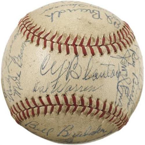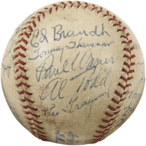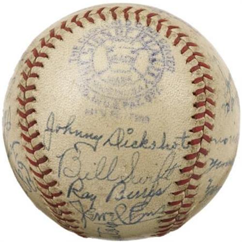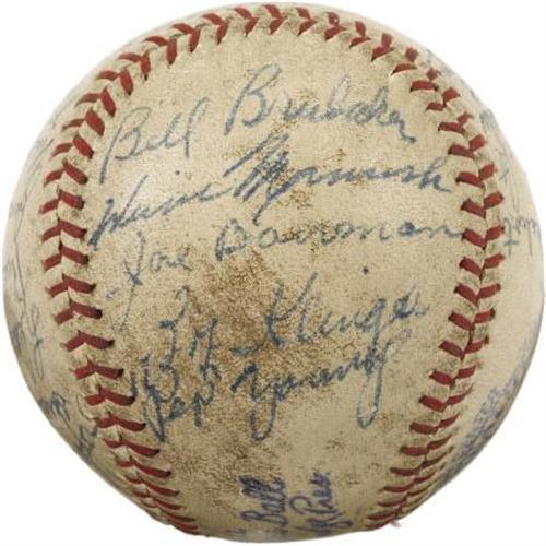 <B>1938 Pittsburgh Pirates Team Signed Baseball with Honus Wagner.</B></I> This swashbuckling crew stood atop the National League heap from July 12th through September 27th, leading by as many as seven games during that stretch, before being nipped at the wire by the surging Chicago Cubs. Twenty-three signatures from these runners-up find a home on an OAL (Harridge) ball, almost as if to suggest that they should have visited the Bronx in October to use such a ball in the Series. All autographs project at a stunning 9/10 or better, and include many of the day's greatest figures: Wagner, both Waner brothers, Traynor, Manush and more. The ball shows apparent game use that clearly predates the autograph session. You'll rarely see prewar signed balls boasting autograph boldness such as this. <I>LOA from PSA/DNA. LOA from James Spence Authentication.</B></I><BR><BR><b>Shipping:</b> Balls, Pucks, etc., Small (<a target="_blank" href="http://www.heritageauctions.com/common/shipping.php">view shipping information</a>)