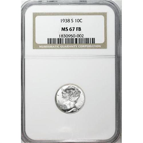 <B>1938-S 10C MS67 Full Bands NGC.</B></I> NGC Census: (61/8). PCGS Population (101/5). Mintage: 8,090,000. Numismedia Wsl. Price for NGC/PCGS coin in MS67: $525. (#5015)<BR><BR><B>Coin Engraver:</B> Adolph A. Weinman<BR><BR><b>Shipping:</b> Coins & Currency (<a target="_blank" href="http://www.heritageauctions.com/common/shipping.php">view shipping information</a>)