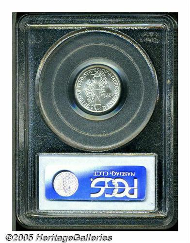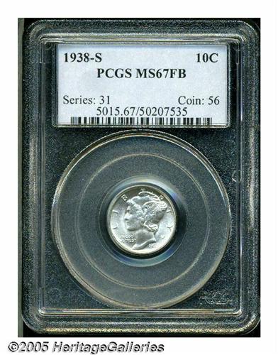 <B>1938-S<10C> MS67 Full Bands PCGS.</B></I> This bright Mercury dime is awash in luster and virtually untoned. All of the design features are well struck, culminating in Full Bands definition. The surfaces are impeccably preserved, revealing no mentionable marks. As of May 2005, PCGS and NGC combined have seen a mere 13 coins of this issue grading finer with the Full Bands designation. Population: 88 in 67, 5 finer (5/05).