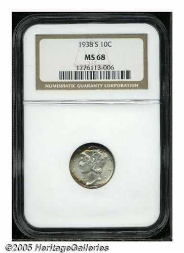 <B>1938-S<10C> MS68 NGC.</B></I> Boldly struck with beautiful satiny-smooth luster, lightly colored centers, and lovely crimson, green, and russet patina near the borders. Exquisitely preserved and mark-free.