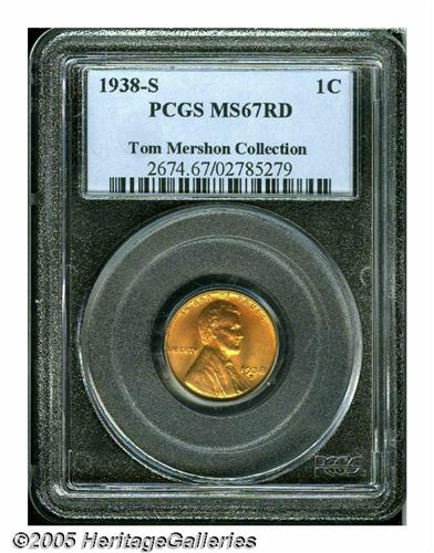 <B>1938-S<1C> MS67 Red PCGS.</B></I> Bright reddish-gold color with nicely struck design elements. A few light ticks are noted on Lincoln's face.<BR><I>From The Tom Mershon #2 All-Time PCGS Registry Set of Lincoln Wheat Cents.</B></I>