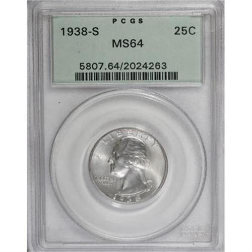 <B>1938-S 25C MS64 PCGS.</B></I> PCGS Population (552/1064). NGC Census: (226/621). Mintage: 2,832,000. Numismedia Wsl. Price for NGC/PCGS coin in MS64: $116. (#5807)<BR><BR><B>Coin Engraver:</B> John Flanagan<BR><BR><b>Shipping:</b> Coins & Currency (<a target="_blank" href="http://www.heritageauctions.com/common/shipping.php">view shipping information</a>)