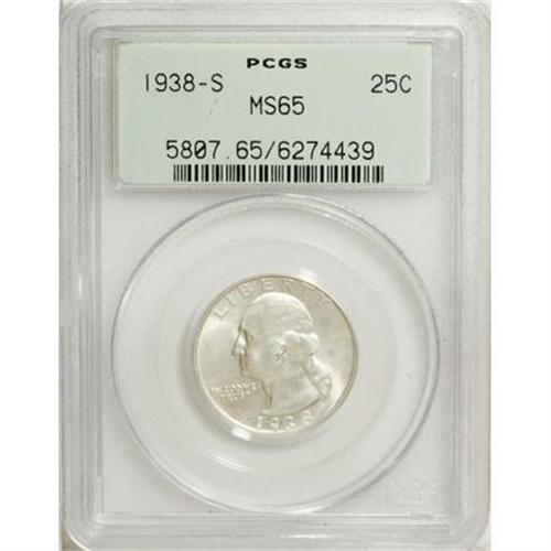 <B>1938-S 25C MS65 PCGS.</B></I> PCGS Population (671/346). NGC Census: (364/244). Mintage: 2,832,000. Numismedia Wsl. Price for NGC/PCGS coin in MS65: $220. (#5807)<BR><BR><B>Coin Engraver:</B> John Flanagan<BR><BR><b>Shipping:</b> Coins & Currency (<a target="_blank" href="http://www.heritageauctions.com/common/shipping.php">view shipping information</a>\)