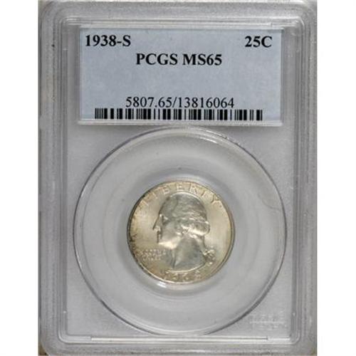 <B>1938-S 25C MS65 PCGS.</B></I> PCGS Population (677/348). NGC Census: (366/244). Mintage: 2,832,000. Numismedia Wsl. Price for NGC/PCGS coin in MS65: $220. (#5807)<BR><BR><B>Coin Engraver:</B> John Flanagan<BR><BR><b>Shipping:</b> Coins & Currency (<a target="_blank" href="http://www.heritageauctions.com/common/shipping.php">view shipping information</a>)
