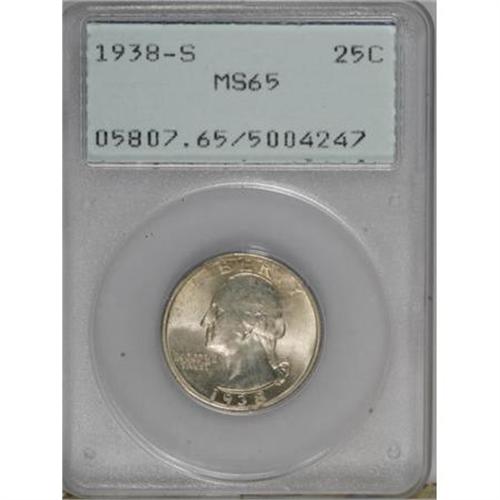 <B>1938-S 25C MS65 PCGS.</B></I> PCGS Population (697/367). NGC Census: (381/251). Mintage: 2,832,000. Numismedia Wsl. Price for NGC/PCGS coin in MS65: $220. (#5807)<BR><BR><B>Coin Engraver:</B> John Flanagan<BR><BR><b>Shipping:</b> Coins & Currency (<a target="_blank" href="http://www.heritageauctions.com/common/shipping.php">view shipping information</a>)