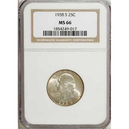 <B>1938-S 25C MS66 NGC.</B></I> NGC Census: (206/38). PCGS Population (319/27). Mintage: 2,832,000. Numismedia Wsl. Price for NGC/PCGS coin in MS66: $320. (#5807)<BR><BR><B>Coin Engraver:</B> John Flanagan<BR><BR><b>Shipping:</b> Coins & Currency (<a target="_blank" href="http://www.heritageauctions.com/common/shipping.php">view shipping information</a>\)
