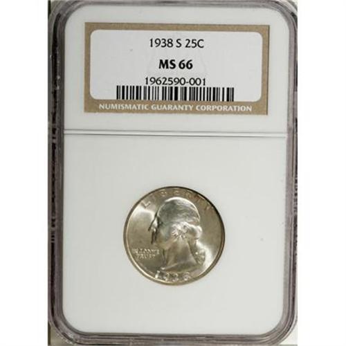 <B>1938-S 25C MS66 NGC.</B></I> NGC Census: (208/38). PCGS Population (335/27). Mintage: 2,832,000. Numismedia Wsl. Price for NGC/PCGS coin in MS66: $320. (#5807)<BR><BR><B>Coin Engraver:</B> John Flanagan<BR><BR><b>Shipping:</b> Coins & Currency (<a target="_blank" href="http://www.heritageauctions.com/common/shipping.php">view shipping information</a>)