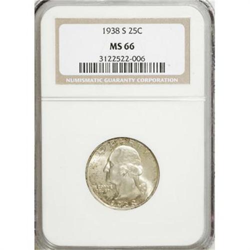 <B>1938-S 25C MS66 NGC.</B></I> NGC Census: (210/38). PCGS Population (340/28). Mintage: 2,832,000. Numismedia Wsl. Price for NGC/PCGS coin in MS66: $320. (#5807)<BR><BR><B>Coin Engraver:</B> John Flanagan<BR><BR><b>Shipping:</b> Coins & Currency (<a target="_blank" href="http://www.heritageauctions.com/common/shipping.php">view shipping information</a>)