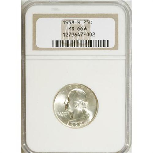 <B>1938-S 25C MS66</B></I><img src="/images/star.gif" width="10" height="10" alt="" border="0"><B> NGC.</B></I> . NGC Census: (212/39). PCGS Population (338/28). Mintage: 2,832,000. Numismedia Wsl. Price for NGC/PCGS coin in MS66: $320. (#5807)<BR><BR><B>Coin Engraver:</B> John Flanagan<BR><BR><b>Shipping:</b> Coins & Currency (<a target="_blank" href="http://www.heritageauctions.com/common/shipping.php">view shipping information</a>)