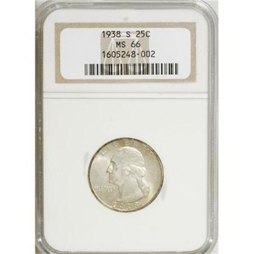 <B>1938-S 25C MS66 NGC.</B></I> . NGC Census: (212/39). PCGS Population (338/28). Mintage: 2,832,000. Numismedia Wsl. Price for NGC/PCGS coin in MS66: $320. (#5807)<BR><BR><B>Coin Engraver:</B> John Flanagan<BR><BR><b>Shipping:</b> Coins & Currency (<a target="_blank" href="http://www.heritageauctions.com/common/shipping.php">view shipping information</a>)