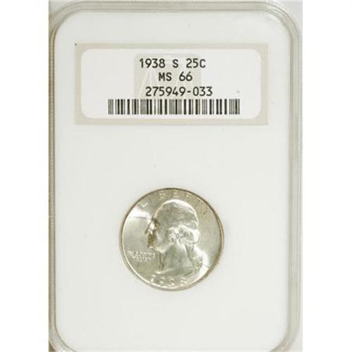 <B>1938-S 25C MS66 NGC.</B></I> . NGC Census: (213/39). PCGS Population (338/28). Mintage: 2,832,000. Numismedia Wsl. Price for NGC/PCGS coin in MS66: $320. (#5807)<BR><BR><B>Coin Engraver:</B> John Flanagan<BR><BR><b>Shipping:</b> Coins & Currency (<a target="_blank" href="http://www.heritageauctions.com/common/shipping.php">view shipping information</a>)
