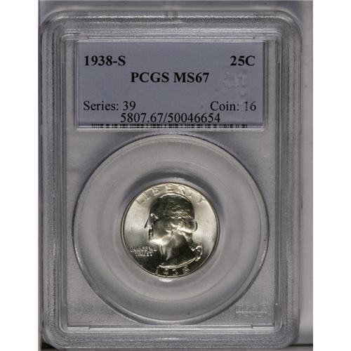 <B>1938-S<25C> MS67 PCGS.</B></I> This scarce mintmarked quarter is rarely found in superior condition such as this piece. The surfaces on this coin are exceptionally lustrous and brilliant with a clean overall appearance. Population: 26 in 67, none are finer (6/06).