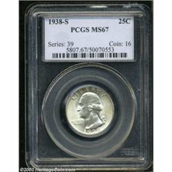 <table><tr><td><TABLE cellSpacing=0 cellPadding=0 width="100%" bgColor=#000000 border=0><TBODY> <TR><TD width="100%"><TABLE cellSpacing=1 cellPadding=3 width="100%" border=0><TBODY><TR><TD width="100%" bgColor=#79735c><FONT face=arial color=#ffffff size=3><B>Description</B> </FONT></TD></TR><TR><TD width="100%" bgColor=#ffffff><FONT face=arial size=2><B>1938-S 25C MS67 PCGS.</B></I> Seldom available in Superb condition, this is an exceptionally pleasing example of this better date S-mint. The softly frosted surfaces are brilliant throughout and there are no obvious abrasions on either side. Extraordinary quality. Population: 21 in 67, 0 finer (9/03). </FONT></TD></TR></TBODY></TABLE></TD></TR></TBODY></TABLE><BR><A name=PricesRealized></A><TABLE cellSpacing=0 cellPadding=0 width="100%" bgColor=#000000 border=0><TBODY><TR><TD width="100%"><TABLE cellSpacing=1 cellPadding=3 width="100%" border=0><TBODY><TR><TD width="100%" bgColor=#79735c><A name=PR><FONT face=arial color=#ffffff size=3><B>Previous Prices from Heritage Auctions</B> </FONT></A></TD></TR><TR><TD bgColor=#f6f6ed><TABLE cellSpacing=0 cellPadding=0 width="100%" border=1><TBODY><TR><TD align=middle width="33%"><B>Date</B></TD><TD align=middle width="33%"><B>Service</B></TD><TD align=middle width="33%"><B>Price</B></TD></TR><TR bgColor=whitesmoke><TD width="33%"><B>05/03/2003</B></TD><TD width="33%">NGC</TD><TD width="33%">$747.50</TD></TR><TR bgColor=whitesmoke><TD width="33%"><B>03/23/2003</B></TD><TD width="33%">PCGS</TD><TD width="33%">$2,185.00</TD></TR><TR bgColor=whitesmoke><TD width="33%"><B>03/01/2003</B></TD><TD width="33%">NGC</TD><TD width="33%">$948.75</TD></TR><TR bgColor=whitesmoke><TD width="33%"><B>09/28/2002</B></TD><TD width="33%">PCGS</TD><TD width="33%">$1,782.50</TD></TR><TR bgColor=whitesmoke><TD width="33%"><B>08/08/2001</B></TD><TD width="33%">PCGS</TD><TD width="33%">$1,523.75</TD></TR><TR bgColor=whitesmoke><TD width="33%"><B>04/05/2001</B></TD><TD width="33%">NGC</TD><TD width="33%">$575.00</TD></TR><TR bgColor=whitesmoke><TD width="33%"><B>05/01/1995</B></TD><TD width="33%">NGC</TD><TD width="33%">$578.00</TD></TR><TR bgColor=whitesmoke><TD width="33%"><B>09/01/1998</B></TD><TD width="33%">PCGS</TD><TD width="33%">$690.00</TD></TR></TBODY></TABLE></TD></TR><TR><TD bgColor=#ffffff><FONT face=arial size=1 ?>PLEASE NOTE: All prices realized reflect the final hammer price PLUS the buyer's premium in auctions that charge a buyer's premium. Each item has a notation at the top of the listing indicating whether that lot included a buyer's premium. Example: A item that sells with a final hammer price of $100 and a 20% buyer's premium will display with a price realized of $120. All information listed is intended to be as accurate as possible, but errors are possible. Please use this guide carefully and inform us of any inaccuracies. </FONT></TD></TR></TBODY></TABLE></TD></TR></TBODY></TABLE><BR><TABLE cellSpacing=0 cellPadding=0 width="100%" bgColor=#000000 border=0><TBODY><TR><TD width="100%"><TABLE cellSpacing=1 cellPadding=3 width="100%" border=0><TBODY><TR><TD width="100%" bgColor=#79735c colSpan=6><FONT face=arial color=#ffffff size=3><B>Price Guide*</B> </FONT></TD></TR><TR bgColor=#f6f6ed><TD align=middle><B>Grade</B> </TD><TD align=middle><B>Coin World<BR>(Trends)</B> </TD><TD align=middle><B>Numismedia<BR>Retail</B> </TD><TD align=middle><B>Numismedia<BR>Wholesale</B> </TD><TD align=middle><B>Coin<BR>Universe</B> </TD><TD align=middle><B>Heritage<BR>Value Index</B> </TD></TR><TR bgColor=#ffffff><TD align=middle>66</TD><TD align=right>---</TD><TD align=right>$385.00</TD><TD align=right>$308.00</TD><TD align=right>$335.00</TD><TD align=right>$252.25</TD></TR><TR style="FONT-WEIGHT: bold" bgColor=#cccfdd><TD align=middle>67</TD><TD align=right>---</TD><TD align=right>---</TD><TD align=right>$1,275.00</TD><TD align=right>$4,250.00</TD><TD align=right>$2,062.50</TD></TR><TR bgColor=#ffffff><TD align=middle>68</TD><TD align=right>---</TD><TD align=right>---</TD><TD align=right>---</TD><TD align=right>---</TD><TD align=right>---</TD></TR><TR bgColor=#ffffff><TD colSpan=6><FONT size=1>*All information listed is intended to be as accurate as possible, but errors are possible. No item may be returned or refused based on this information which is provided as a service to our customers. You should contact each pricing source directly to determine the accuracy of this information. </FONT></TD></TR></TBODY></TABLE></TD></TR></TBODY></TABLE><BR><TABLE cellSpacing=0 cellPadding=0 width="100%" bgColor=#000000 border=0><TBODY><TR><TD width="100%"><TABLE cellSpacing=1 cellPadding=3 width="100%" border=0><TBODY><TR><TD width="100%" bgColor=#79735c><FONT face=arial color=#ffffff size=3><B>Population Guide</B> </FONT></TD></TR><TR bgColor=#ffffff><TD align=middle><!-- Begin Output of Population Grid--><TABLE cellSpacing=0 cellPadding=0 width="100%" border=0><TBODY><TR><TD vAlign=center><TABLE cellSpacing=0 width="100%" border=1 cellsadding="3"><TBODY><TR><TD vAlign=center><TABLE cellSpacing=0 cellPadding=3 width="100%" border=1><TBODY><TR><TD vAlign=center align=middle bgColor=#f0f1e8 colSpan=2 <CENTER><FONT face=Arial size=2><B>PCGS Pop </B></FONT><CENTER></CENTER></TD><TD vAlign=center align=middle bgColor=#f0f1e8 colSpan=2><CENTER><FONT face=Arial size=2><B>NGC Pop</B></CENTER></FONT></TD></TR><TR><TD vAlign=center><FONT face=Arial size=2>(67)</FONT> </TD><TD vAlign=center align=right><FONT face=Arial size=2>24</FONT> </TD><TD vAlign=center><FONT face=Arial size=2>(67)</FONT> </TD><TD vAlign=center align=right><FONT face=Arial size=2>29</FONT> </TD></TR><TR><TD vAlign=center><FONT face=Arial size=2>(>67)</FONT> </TD><TD vAlign=center align=right><FONT face=Arial size=2>0</FONT> </TD><TD vAlign=center><FONT face=Arial size=2>(>67)</FONT> </TD><TD vAlign=center align=right><FONT face=Arial size=2>1</FONT> </TD></TR></TBODY></TABLE></TD></TR></TBODY></TABLE></TD></TR></TBODY></TABLE><!-- End Output of Population Grid--></TD