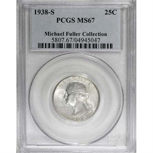 <B>1938-S 25C MS67 PCGS.</B></I> The '38-S quarter has a relatively high survivorship in Mint State. About 700 pieces have been certified at MS65 by PCGS; the Premium Gem population is around half of that number. This specimen displays bright, lustrous surfaces that are visited by speckles of light-tan patina. Sharp definition is apparent on the devices, and the surfaces are well preserved. An inoffensive small linear mark is noted on Washington's cheekbone. Population: 27 in 67, 0 finer (8/07). <BR><I>From The Michael Fuller Collection.</B></I><BR><BR><B>Coin Engraver:</B> John Flanagan<BR><BR><b>Shipping:</b> Coins & Currency (<a target="_blank" href="http://www.heritageauctions.com/common/shipping.php">view shipping information</a>)