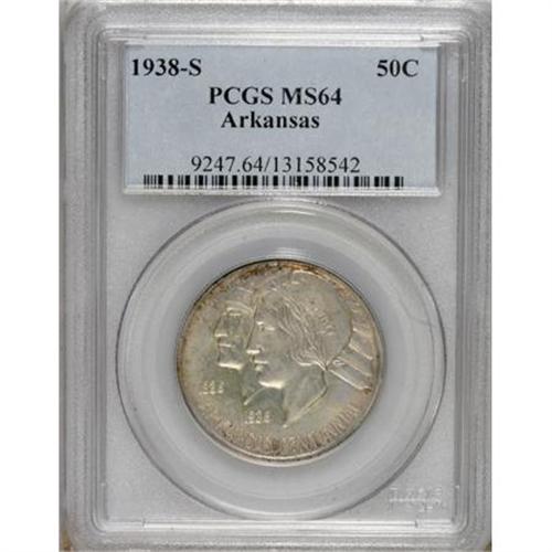 <B>1938-S 50C Arkansas MS64 PCGS.</B></I> PCGS Population (275/213). NGC Census: (192/140). Mintage: 3,156. Numismedia Wsl. Price for NGC/PCGS coin in MS64: $160. (#9247)<BR><BR><b>Shipping:</b> Coins & Currency (<a target="_blank" href="http://www.heritageauctions.com/common/shipping.php">view shipping information</a>)