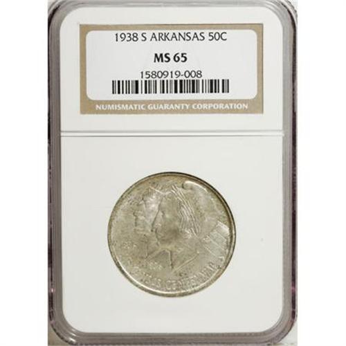 <B>1938-S 50C Arkansas MS65 NGC.</B></I> NGC Census: (120/21). PCGS Population (155/57). Mintage: 3,156. Numismedia Wsl. Price for NGC/PCGS coin in MS65: $460. (#9247)<BR><BR><b>Shipping:</b> Coins & Currency (<a target="_blank" href="http://www.heritageauctions.com/common/shipping.php">view shipping information</a>\)