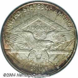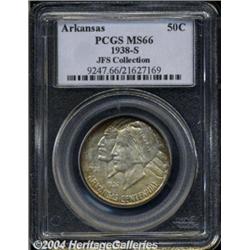 <B>1938-S<50C> Arkansas MS66 PCGS.</B></I> Splashes of gold, red, sea-green, and crimson visit the lustrous surfaces on each side. The design elements feature exquisite strike definition throughout. A few small, trivial marks on the obverse portraits are mentioned for accuracy.<BR><I>Ex: Long Beach Signature Sale (Heritage, 2/01), lot 6026, which realized $2,415.</B></I><BR><I>From the JFS Collection, the #1 All-Time PCGS Registry Set.</B></I> <BR><BR><B>Important notice:</B> Heritage usually auctions material at the rate of 200-250 lots per hour. On some occasions eBay Live bid software or the Internet may not be able to keep up with the pace of the auction. We recommend placing a realistic absentee bid now as insurance to avoid disappointment. Occasionally the auctioneer may eliminate or reject an eBay Live bid, and the auctioneer may also reopen a lot after the close of the eBay live bidding (usually because we missed an audience bid), and may reject your bid even if it shows you as the winning bidder. By bidding via eBay Live, you agree that Heritage may award the lot to another bidder at its sole discretion under the circumstances described above or any other reasonable circumstances. Since eBay bids are not shown to us until we open the lot on the floor, we treat those bids just like floor bids. In most cases the floor responds before the eBay bid is presented to us, due to Internet lag time, so for consistency we have made it a policy that floor bids are always considered first over tie eBay live bids. Also please note that all Heritage lots purchased through eBay Live carry a 20% Buyer's Premium. Please make sure you read the Terms and Conditions before you bid. </span></font></tr></table></td></tr></table>