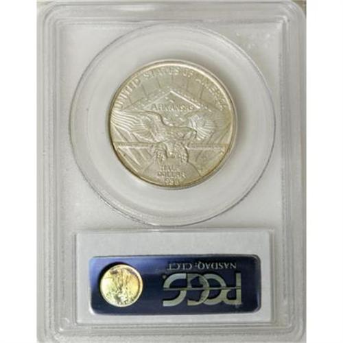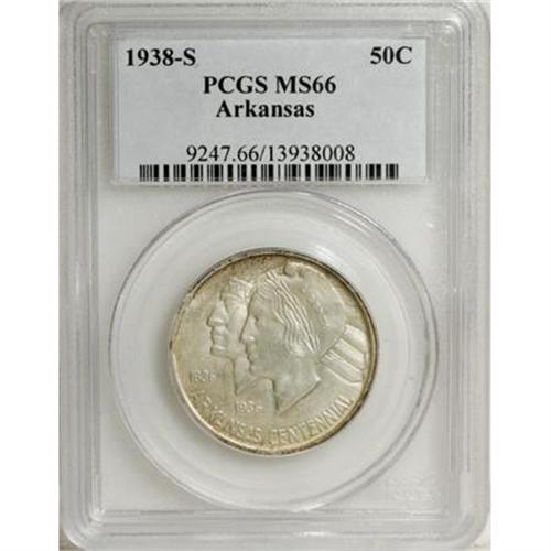 <B>1938-S 50C Arkansas MS66 PCGS.</B></I> One of several low-mintage issues from the later years of the Arkansas series, this one consisting of a mere 3,156 pieces. This luminous and satiny example, primarily silver-gray with a measure of tan toning at the margins, is tied for the finest certified by PCGS (10/07).<BR><BR><b>Shipping:</b> Coins & Currency (<a target="_blank" href="http://www.heritageauctions.com/common/shipping.php">view shipping information</a>)