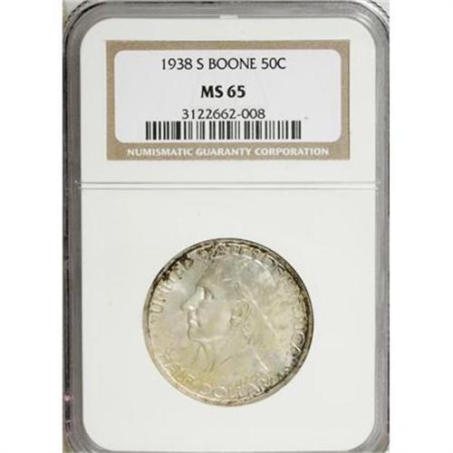 <B>1938-S 50C Boone MS65 NGC.</B></I> . NGC Census: (141/110). PCGS Population (192/148). Mintage: 2,100. Numismedia Wsl. Price for NGC/PCGS coin in MS65: $500. (#9276)<BR><BR><b>Shipping:</b> Coins & Currency (<a target="_blank" href="http://www.heritageauctions.com/common/shipping.php">view shipping information</a>)