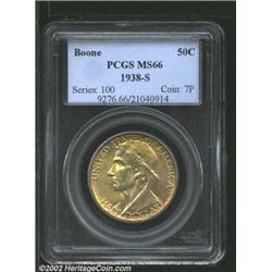 1938-S 50C Boone MS66 PCGS. Steel-lilac, apricot-tan, and lemon-yellow toning is splashed over both sides in a more or less even manner. This fully lustrous example would fit nicely into a collection of toned Gems. Important notice: We expect to be auctioning lots at the rate of 200-250 per hour. Sometimes eBay Premier live bid software cannot keep up with that pace, so we strongly recommend that you place a realistic proxy bid now as insurance to avoid disappointment. Also please note that all Heritage/CAA lots purchased through eBay Premier carry a 20% Buyer's Premium.