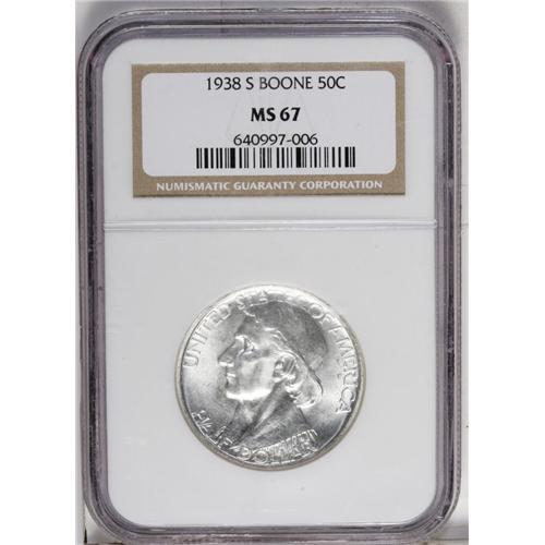 1938-S 50C Boone MS67 NGC. An essentially untoned Supe