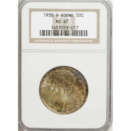 <B>1938-S 50C Boone MS67 NGC.</B></I> Areas of reddish-orange, gold, and denim-blue patina grace both sides of this shining Superb Gem. This final-year S-mint piece is one of just 2,100 examples coined. Census: 22 in 67, 1 finer (10/07).<BR><BR><b>Shipping:</b> Coins & Currency (<a target="_blank" href="http://www.heritageauctions.com/common/shipping.php">view shipping information</a>)
