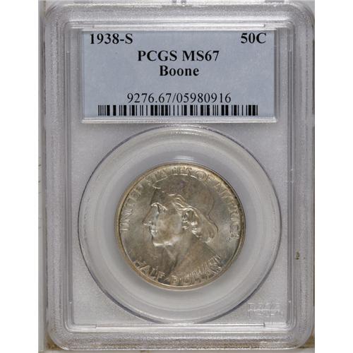 <B>1938-S 50C Boone MS67 PCGS.</B></I> This lustrous violet-blue representative is one of just 2,100 pieces coined. On the reverse, the figures exhibit excellent definition. Population: 29 in 67, 1 finer (12/06).<BR><BR><b>Shipping:</b> Coins & Currency (<a target="_blank" href="http://www.heritageauctions.com/common/shipping.php">view shipping information</a>)