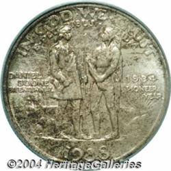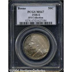 <B>1938-S<50C> Boone MS67 PCGS.</B></I> Finally, the end of this series was reached in 1938 with no later issues produced. Each of the three 1938 issues had a net mintage of 2,100 coins out of 5,000 struck. The remaining 2,900 from each of the three mints were later melted. This is a splendid example with exceptional aesthetic appeal. Each side has original heather toning with amazing iridescent coloration. Population: 22 in 67, 1 finer (6/04).<BR><I>Ex: Long Beach Signature Sale (Heritage, 9/03), lot 9244, which realized $2,530.</B></I><BR><I>From the JFS Collection, the #1 All-Time PCGS Registry Set.</B></I> <BR><BR><B>Important notice:</B> Heritage usually auctions material at the rate of 200-250 lots per hour. On some occasions eBay Live bid software or the Internet may not be able to keep up with the pace of the auction. We recommend placing a realistic absentee bid now as insurance to avoid disappointment. Occasionally the auctioneer may eliminate or reject an eBay Live bid, and the auctioneer may also reopen a lot after the close of the eBay live bidding (usually because we missed an audience bid), and may reject your bid even if it shows you as the winning bidder. By bidding via eBay Live, you agree that Heritage may award the lot to another bidder at its sole discretion under the circumstances described above or any other reasonable circumstances. Since eBay bids are not shown to us until we open the lot on the floor, we treat those bids just like floor bids. In most cases the floor responds before the eBay bid is presented to us, due to Internet lag time, so for consistency we have made it a policy that floor bids are always considered first over tie eBay live bids. Also please note that all Heritage lots purchased through eBay Live carry a 20% Buyer's Premium. Please make sure you read the Terms and Conditions before you bid. </span></font></tr></table></td></tr></table>