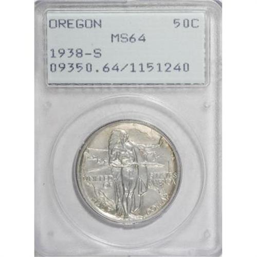 <B>1938-S 50C Oregon MS64 PCGS.</B></I> PCGS Population (407/1161). NGC Census: (152/897). Mintage: 6,006. Numismedia Wsl. Price for NGC/PCGS coin in MS64: $196. (#9350)<BR><BR><b>Shipping:</b> Coins & Currency (<a target="_blank" href="http://www.heritageauctions.com/common/shipping.php">view shipping information</a>\)