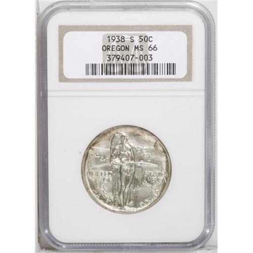 1938-S 50C Oregon MS66 NGC. Intermittent brick-red and