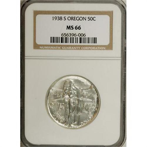 <B>1938-S 50C Oregon MS66 NGC.</B></I> NGC Census: (443/131). PCGS Population (426/105). Mintage: 6,006. Numismedia Wsl. Price for NGC/PCGS coin in MS66: $356. (#9350)<BR><BR><b>Shipping:</b> Coins & Currency (<a target="_blank" href="http://www.heritageauctions.com/common/shipping.php">view shipping information</a>)