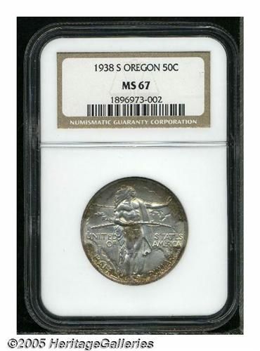 <B>1938-S<50C> Oregon MS67 NGC.</B></I> Russet tab toning graces the obverse, while the reverse is patinated in medium golden-brown and olive-gray colors. An exquisitely struck and undisturbed Superb Gem that clearly reposed many years in its cardboard holder of issue, which is not included. Just 6,006 pieces were struck.