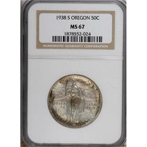 <B>1938-S 50C Oregon MS67 NGC.</B></I> NGC Census: (113/17). PCGS Population (95/9). Mintage: 6,006. Numismedia Wsl. Price for NGC/PCGS coin in MS67: $735. (#9350)<BR><BR><b>Shipping:</b> Coins & Currency (<a target="_blank" href="http://www.heritageauctions.com/common/shipping.php">view shipping information</a>\)