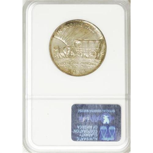 <B>1938-S 50C Oregon MS67 NGC.</B></I> An S-mint from late in this long-running series, with iridescent forest-green, magenta, and yellow near the rims and gray-gold surfaces elsewhere. Boldly struck with impressive eye appeal. NGC has graded 17 finer pieces (10/07).<BR><BR><b>Shipping:</b> Coins & Currency (<a target="_blank" href="http://www.heritageauctions.com/common/shipping.php">view shipping information</a>)
