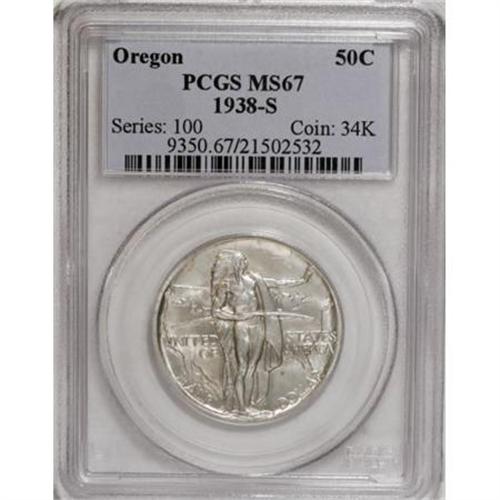 <B>1938-S 50C Oregon MS67 PCGS.</B></I> Elegant, understated luster with subtle shimmer. The silver-gray surfaces show faint elements of gold and rose-violet in the fields. PCGS has graded nine finer pieces (1/08).<BR><BR><b>Shipping:</b> Coins & Currency (<a target="_blank" href="http://www.heritageauctions.com/common/shipping.php">view shipping information</a>)