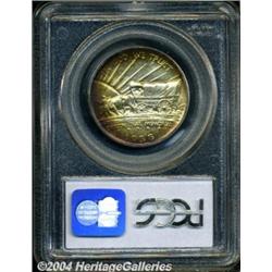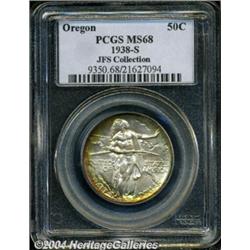<B>1938-S<50C> Oregon MS68 PCGS.</B></I> Rich golden-brown, rose-russet, apple-green, and lilac colors decorate the border areas across this beautifully toned Superb Gem. The magnificently preserved surfaces provide exceptional eye appeal. A well struck example of this penultimate San Francisco Mint issue. Only 6,006 pieces were struck, with the extra six coins undoubtedly intended for assay. The combined forces of PCGS and NGC have certified 23 examples as MS68 with none finer (some of these undoubtedly being resubmissions).<BR><I>From the JFS Collection, the #1 All-Time PCGS Registry Set.</B></I> <BR><BR><B>Important notice:</B> Heritage usually auctions material at the rate of 200-250 lots per hour. On some occasions eBay Live bid software or the Internet may not be able to keep up with the pace of the auction. We recommend placing a realistic absentee bid now as insurance to avoid disappointment. Occasionally the auctioneer may eliminate or reject an eBay Live bid, and the auctioneer may also reopen a lot after the close of the eBay live bidding (usually because we missed an audience bid), and may reject your bid even if it shows you as the winning bidder. By bidding via eBay Live, you agree that Heritage may award the lot to another bidder at its sole discretion under the circumstances described above or any other reasonable circumstances. Since eBay bids are not shown to us until we open the lot on the floor, we treat those bids just like floor bids. In most cases the floor responds before the eBay bid is presented to us, due to Internet lag time, so for consistency we have made it a policy that floor bids are always considered first over tie eBay live bids. Also please note that all Heritage lots purchased through eBay Live carry a 20% Buyer's Premium. Please make sure you read the Terms and Conditions before you bid. </span></font></tr></table></td></tr></table>