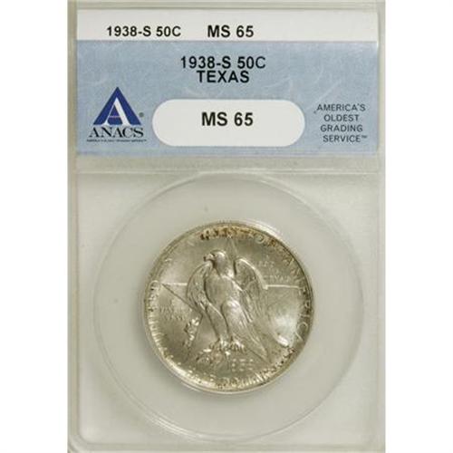 <B>1938-S 50C Texas MS65 ANACS.</B></I> . NGC Census: (286/320). PCGS Population (395/308). Mintage: 3,814. Numismedia Wsl. Price for NGC/PCGS coin in MS65: $440. (#9396)<BR><BR><b>Shipping:</b> Coins & Currency (<a target="_blank" href="http://www.heritageauctions.com/common/shipping.php">view shipping information</a>)