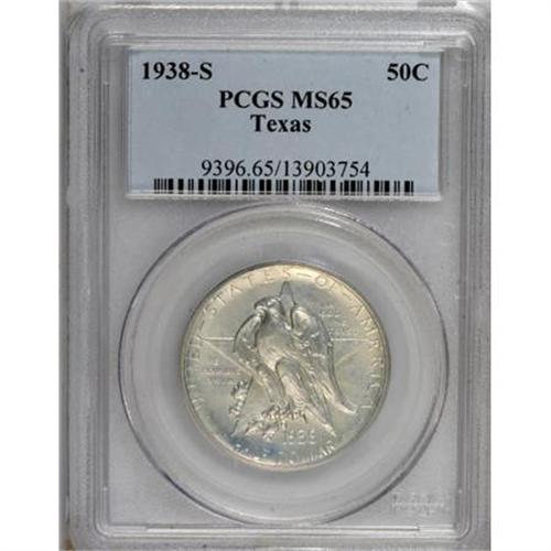 <B>1938-S 50C Texas MS65 PCGS.</B></I> PCGS Population (390/305). NGC Census: (283/316). Mintage: 3,814. Numismedia Wsl. Price for NGC/PCGS coin in MS65: $440. (#9396)<BR><BR><b>Shipping:</b> Coins & Currency (<a target="_blank" href="http://www.heritageauctions.com/common/shipping.php">view shipping information</a>)